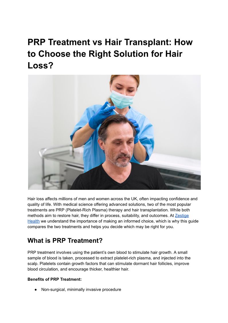 PRP Treatment vs Hair Transplant: Choosing the Right Hair Loss Solution