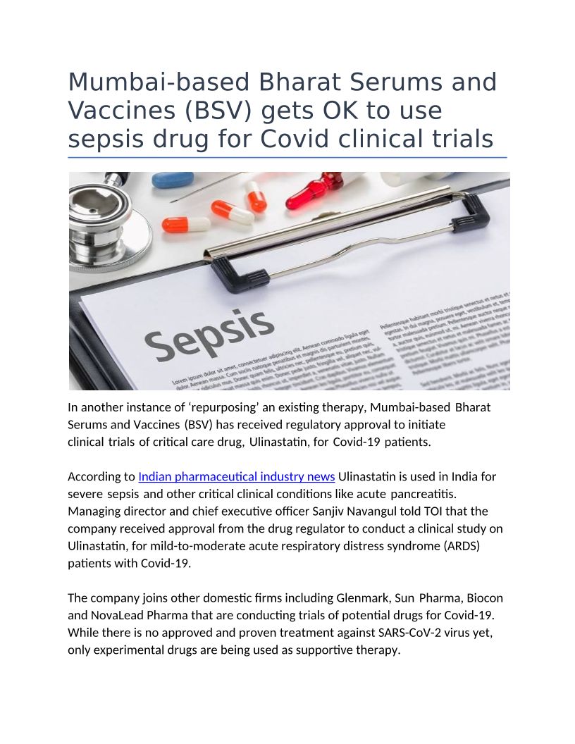 Mumbai-based Bharat Serums and Vaccines (BSV) gets OK to use sepsis drug for Covid clinical trials