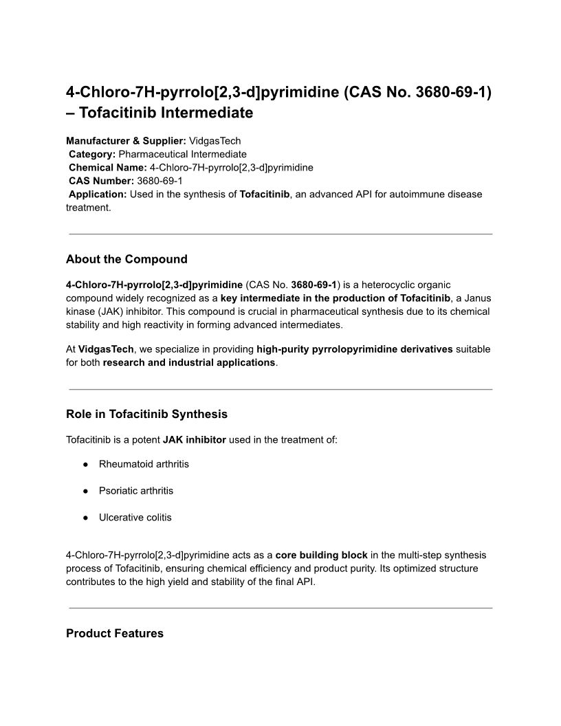 4-Chloro-7H-pyrrolo[2,3-d]pyrimidine (CAS No. 3680-69-1) – Tofacitinib Intermediate
