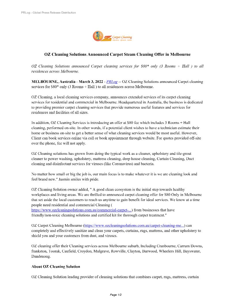 OZ Cleaning Solutions Announced Carpet Steam Cleaning Offer in Melbourne