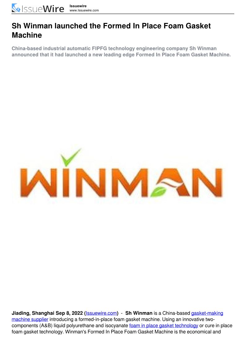 Sh Winman launched the Formed In Place Foam Gasket Machine