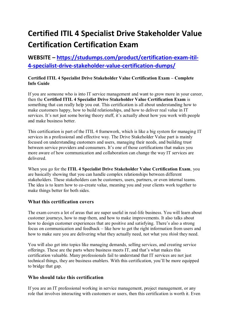 Certified ITIL 4 Specialist Drive Stakeholder Value Certification Certification Exam