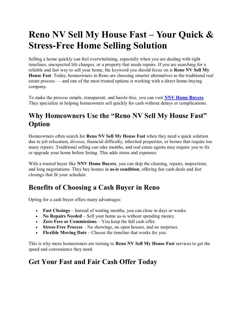 Reno NV Sell My House Fast – Your Quick and Stress-Free Home Selling Solution
