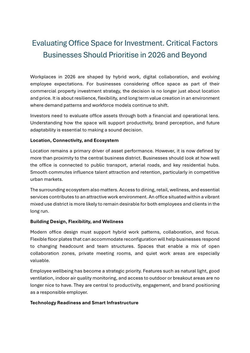Evaluating Office Space for Investment. Critical Factors Businesses Should Prioritise in 2026 and Beyond