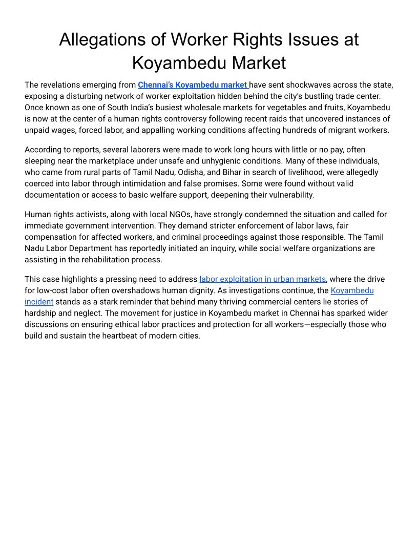 Allegations of Worker Rights Issues at Koyambedu Market