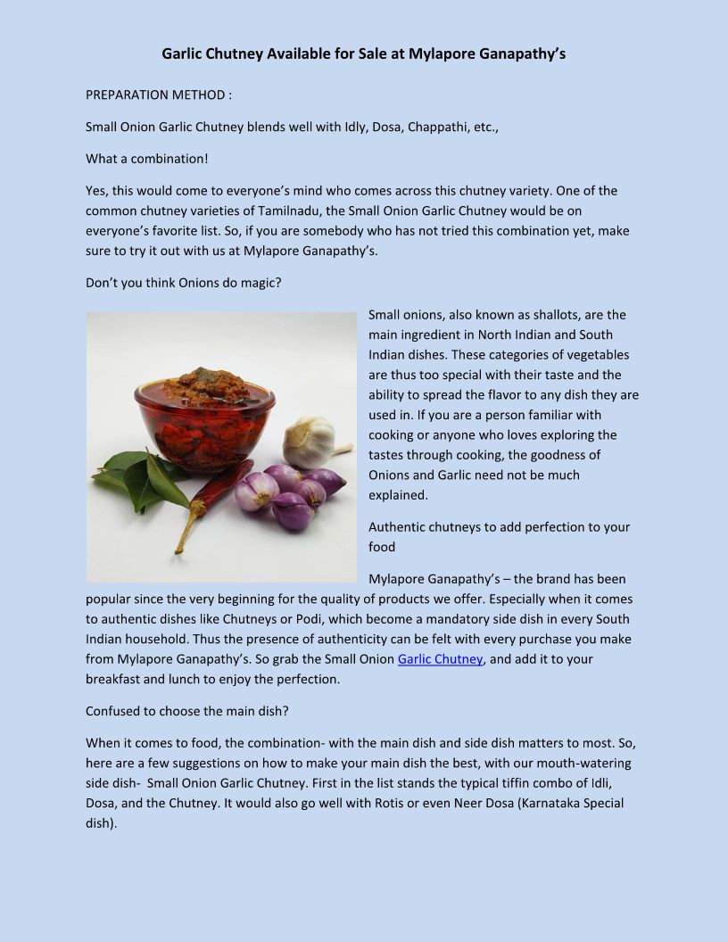 Garlic Chutney Available for Sale at Mylapore Ganapathy’s