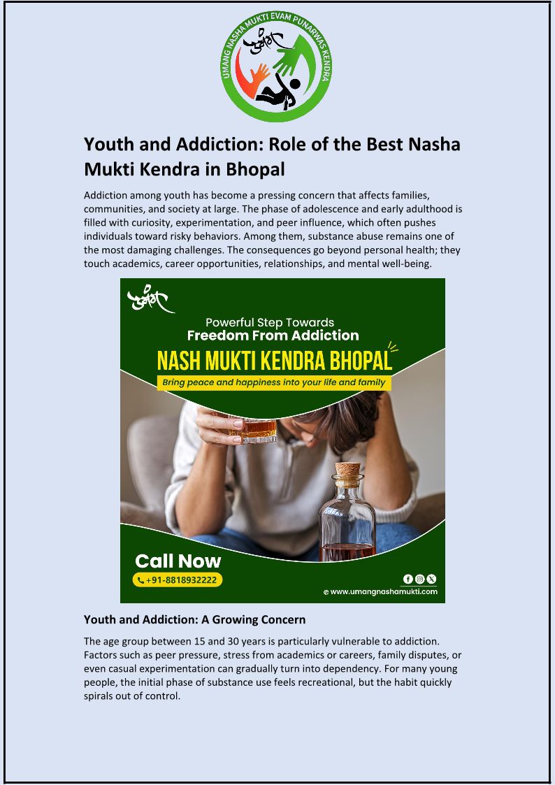 Youth and Addiction and Role of the Best Nasha Mukti Kendra in Bhopal