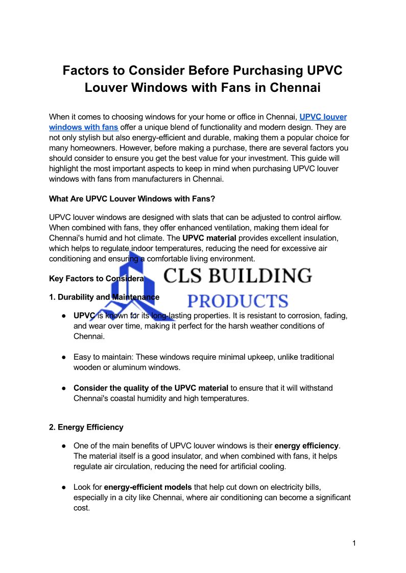 Factors to Consider Before Purchasing UPVC Louver Windows with Fans in Chennai