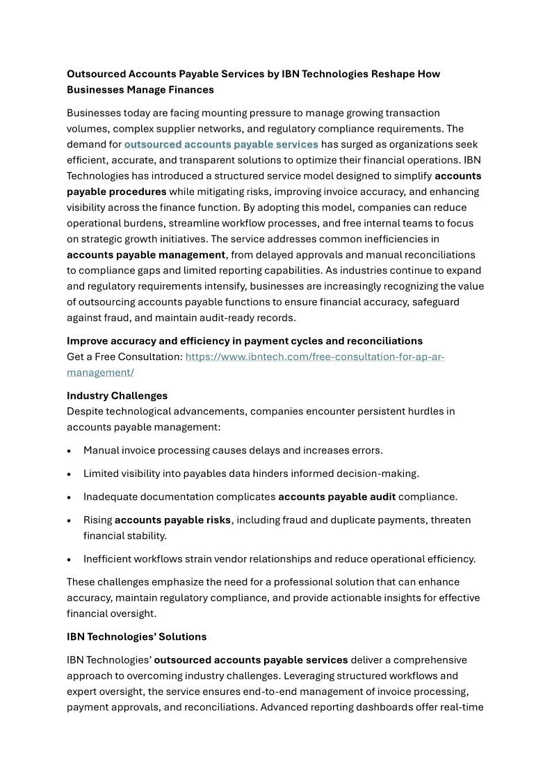 Outsourced Accounts Payable Services by IBN Technologies Reshape How Businesses Manage Finances
