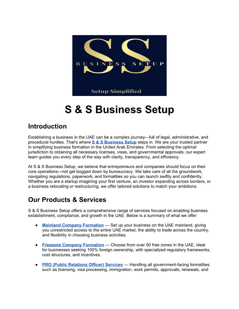 Corporate Profile of S & S Business Setup Mainland, Freezones, and PRO Services