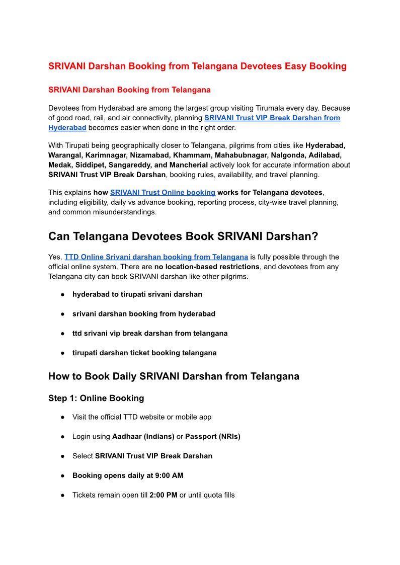 SRIVANI Darshan Booking from Telangana Devotees Easy Booking