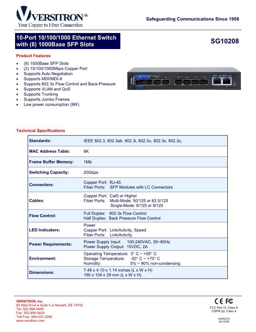 10-Port Unmanaged Switch | 2-RJ45 Ethernet Ports, 8-SFP Ports