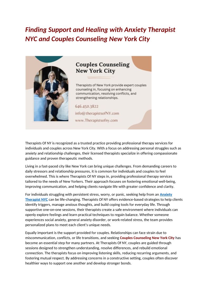 Finding Support and Healing with Anxiety Therapist NYC and Couples Counseling New York City