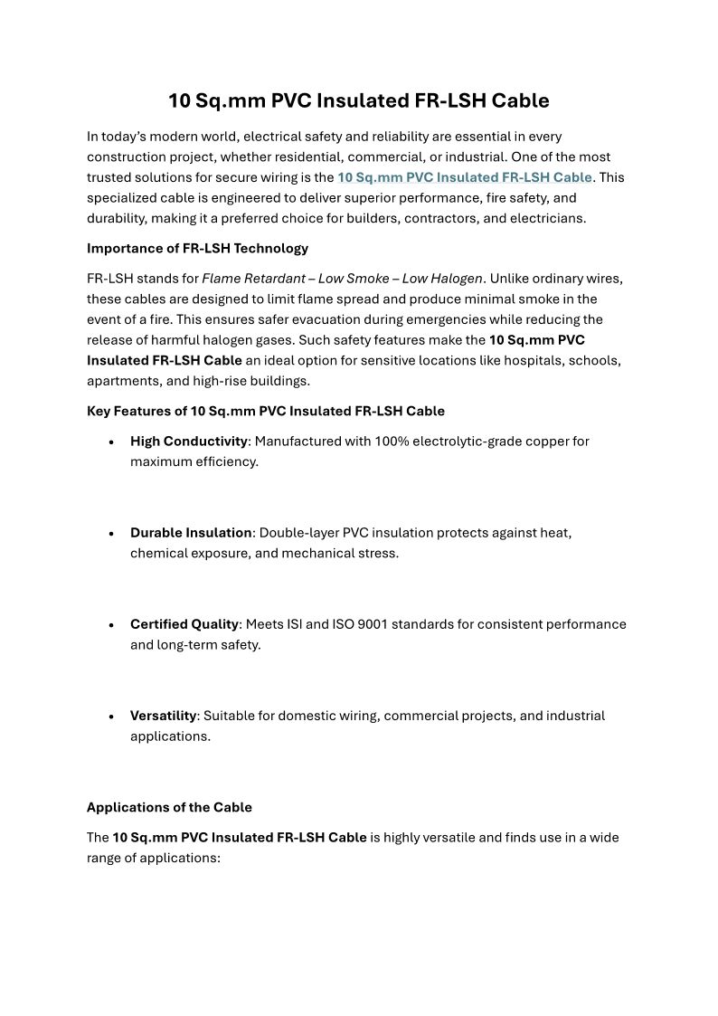 10 Sq.mm PVC Insulated FR-LSH Cable – Durable & Safe Wiring Solution