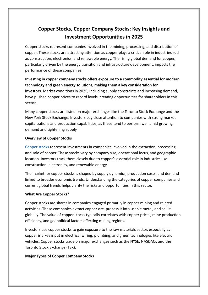 Copper Stocks, Copper Company Stocks Key Insights and Investment Opportunities in 2025