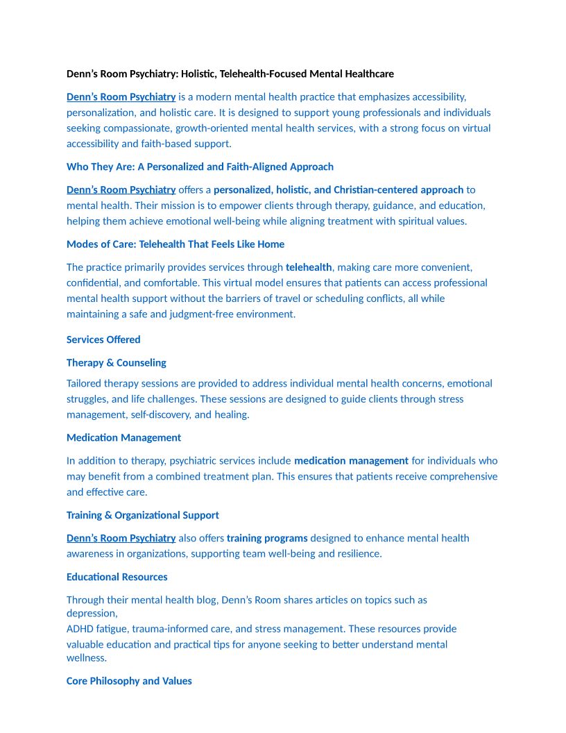 Denn’s Room Psychiatry: Holistic, Telehealth-Focused Mental Healthcare