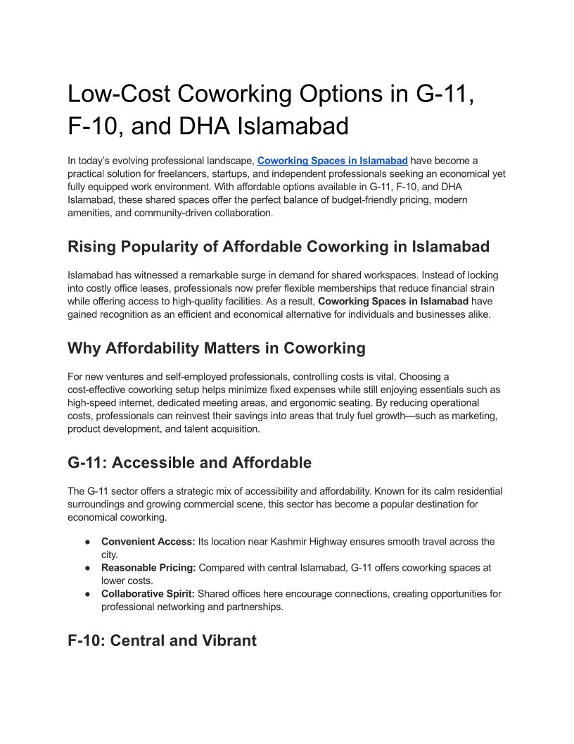 Low-Cost Coworking Options in G-11, F-10, and DHA Islamabad