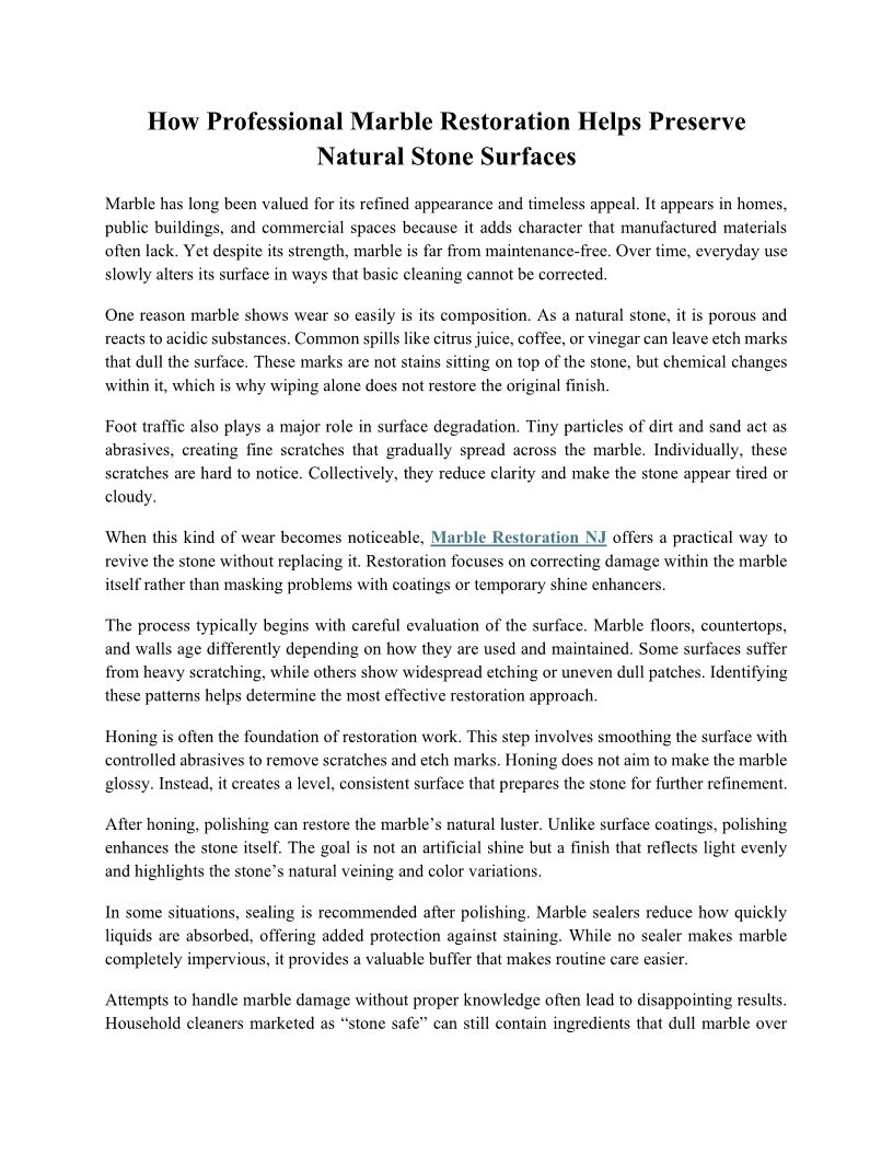 How Professional Marble Restoration Helps Preserve Natural Stone Surfaces