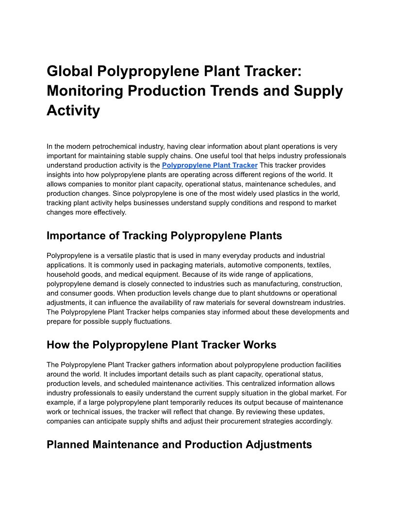 Global Polypropylene Plant Tracker: Monitoring Production Trends and Supply Activity
