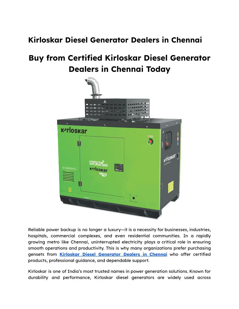 Buy from Certified Kirloskar Diesel Generator Dealers in Chennai Today