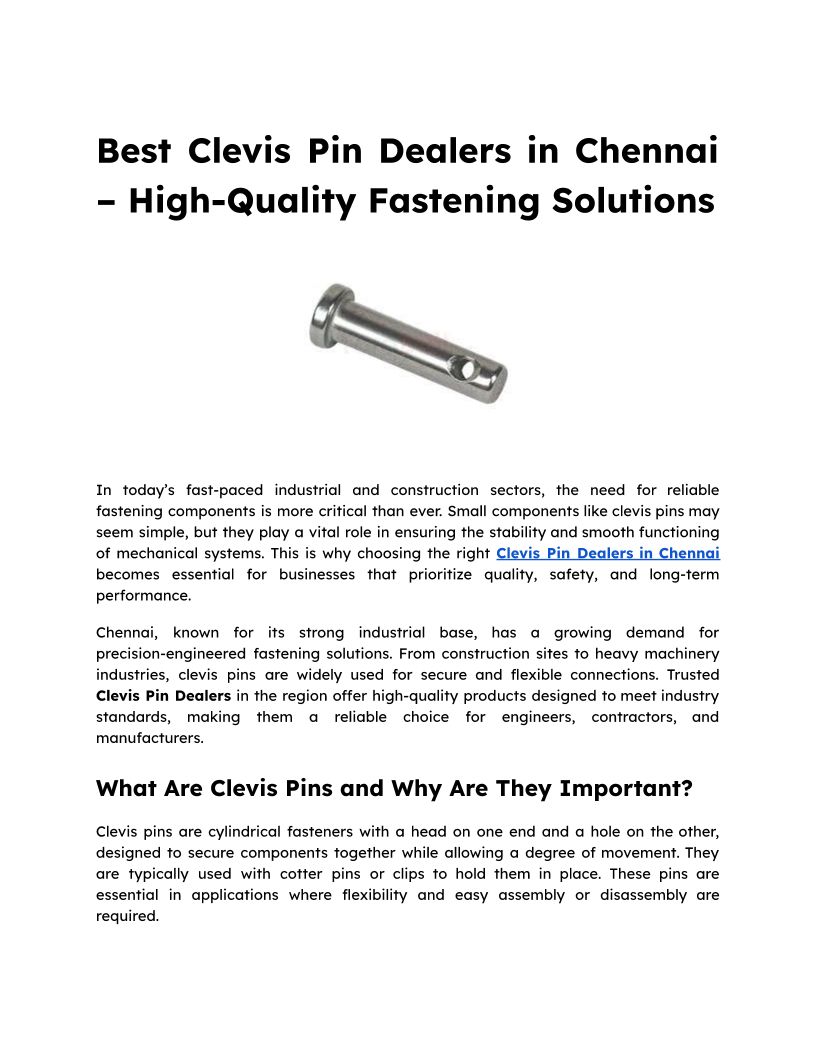 Best Clevis Pin Dealers in Chennai – High-Quality Fastening Solutions
