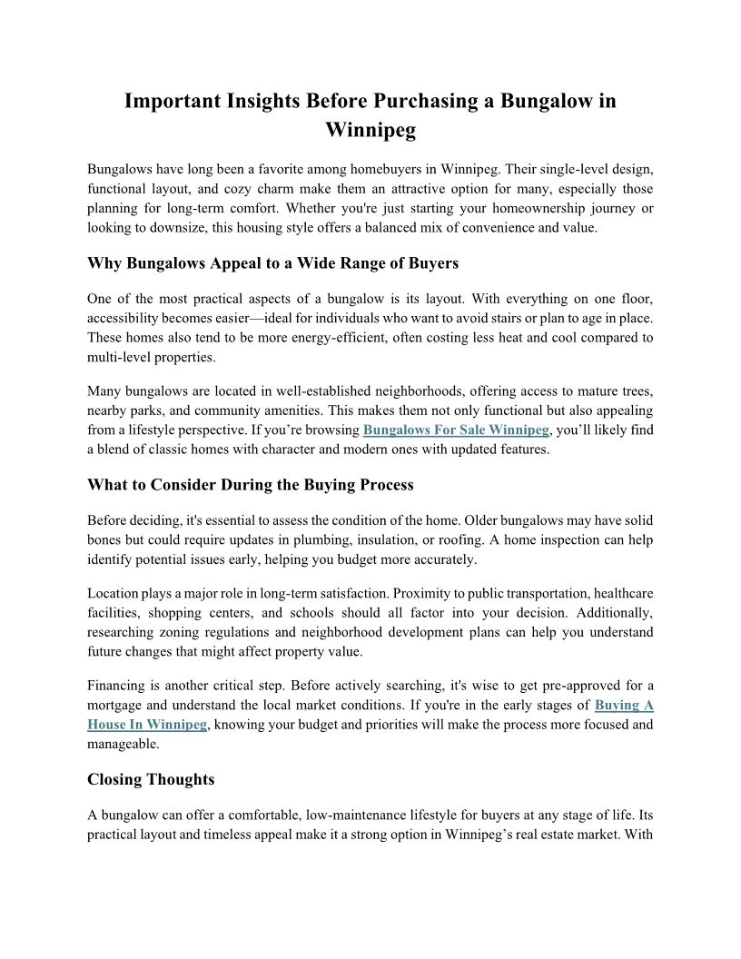 Important Insights Before Purchasing a Bungalow in Winnipeg