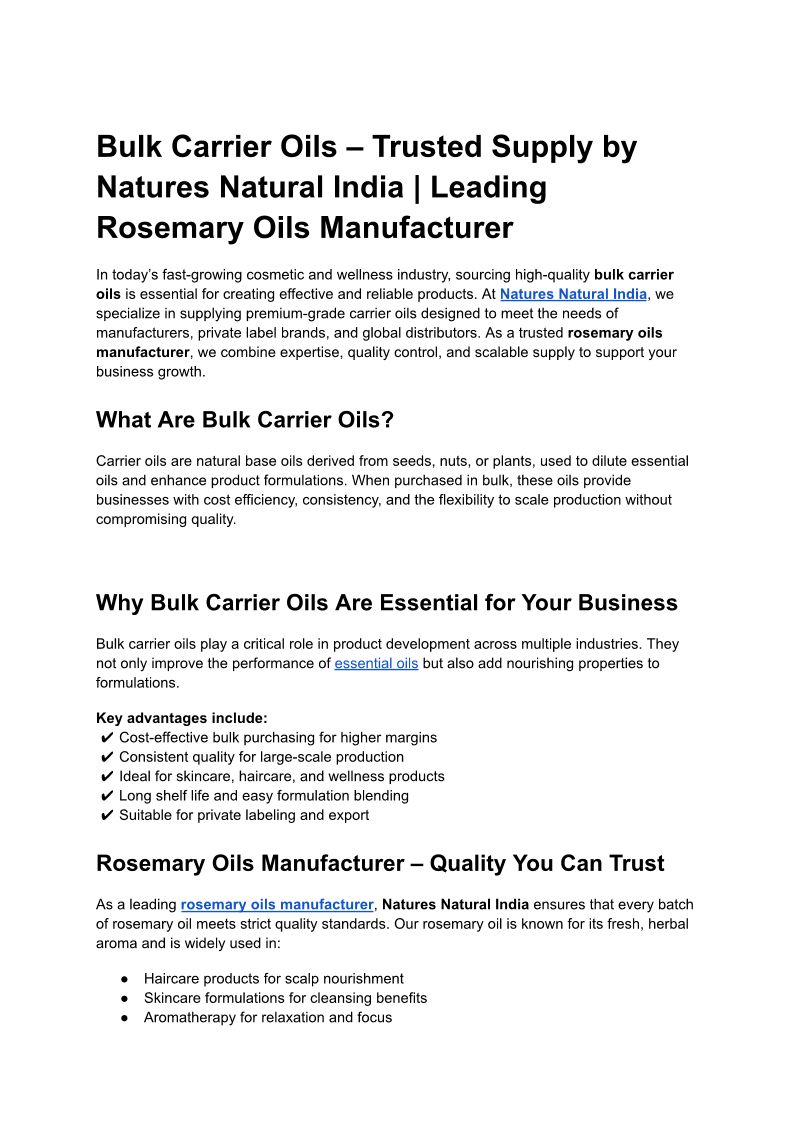 Bulk Carrier Oils – Trusted Supply by Natures Natural India _ Leading Rosemary Oils Manufacturer