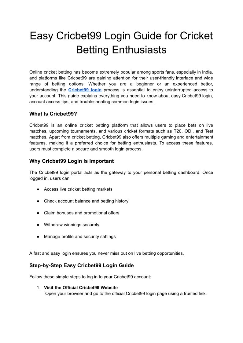 Easy Cricbet99 Login Guide for Cricket Betting Enthusiasts