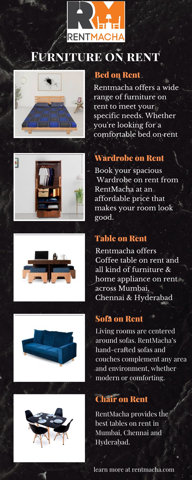 We at RentMacha are here to provide you the best options of Stylish Appliances and Furniture on Rent in Chennai, Mumbai and Hyderabad.