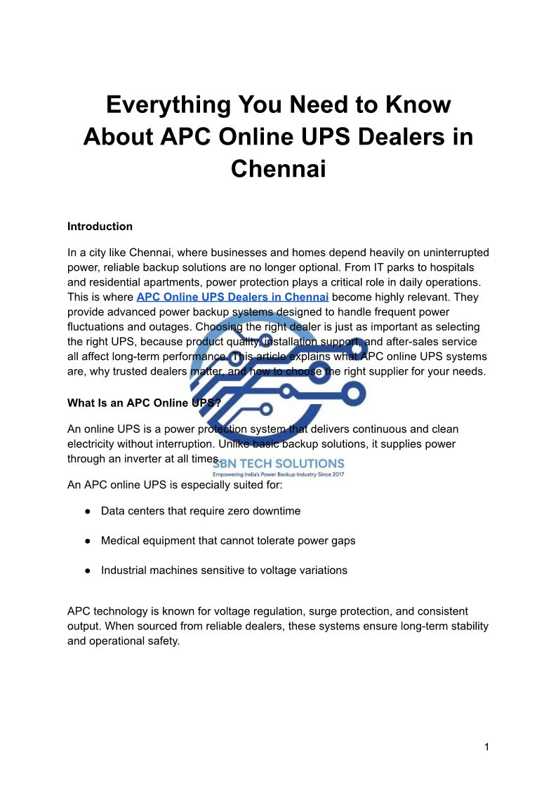 SBN Tech Solutions delivers reliable power backup since 2017 and is leading Online UPS Dealers in Chennai trusted!!! https://www.sbntechsolutions.in
