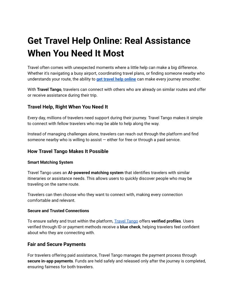 TravelTango connects travelers needing help with those offering it. With AI matching, verified profiles & real-time updates, it makes every trip safer & easy.