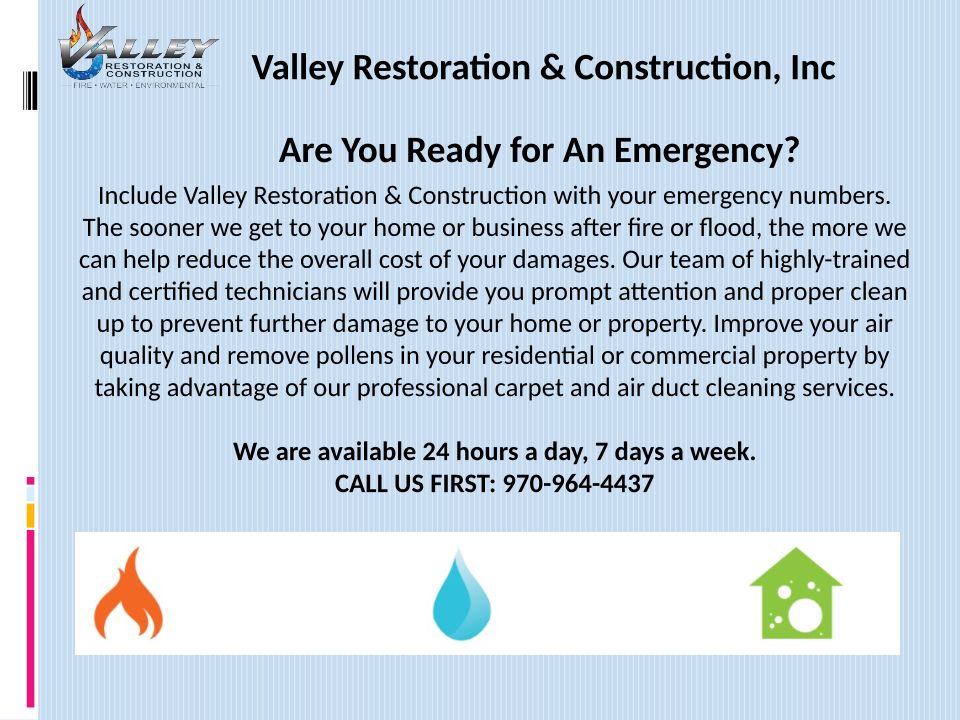 Are you ready for an emergency? Add 970-964-4437 to your contacts and call us first. We work with your insurance to handle every stage of your project.