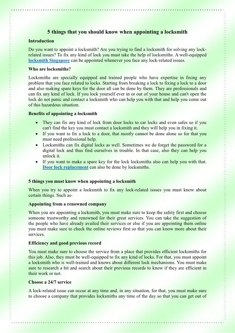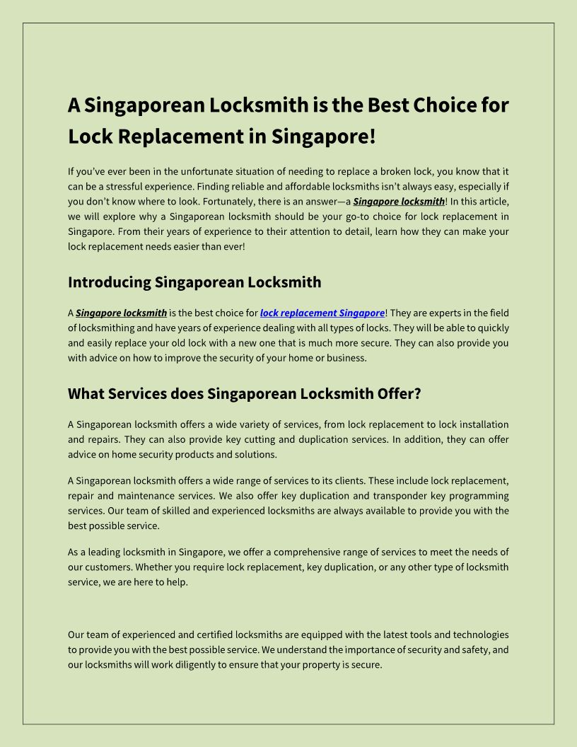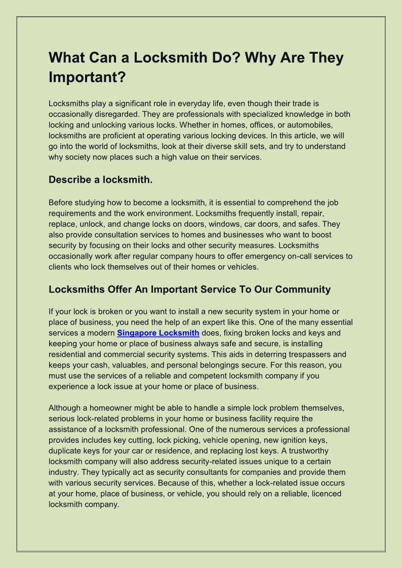 WHIZ Locksmith Singapore is dedicated to provide top-notch services and making sure that every job is completed in a tidy. https://www.whizlocksmith.com/