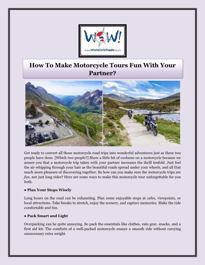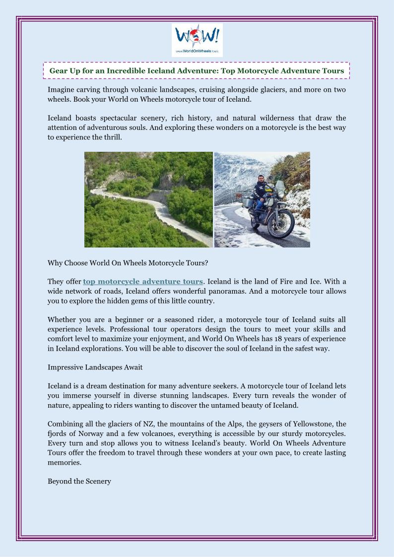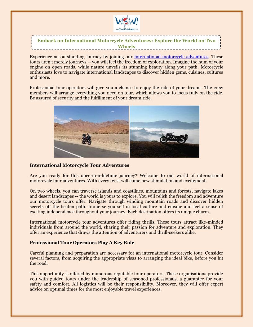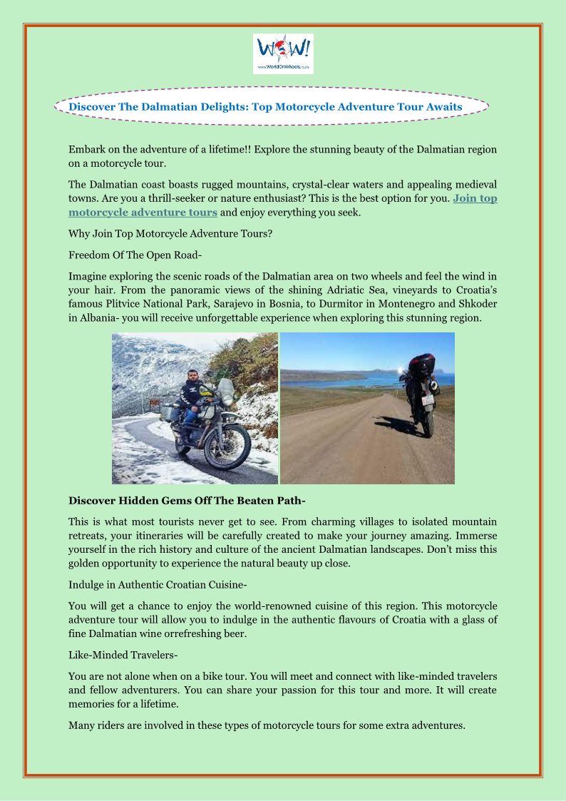 World On Wheels is a reliable and professional organizer, specializing in fully supported and guided tours.